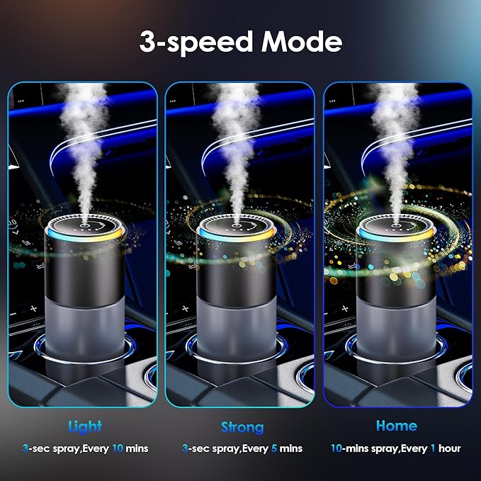 - π¬οΈ 3-Step Scent Control Delivers zero-noise operation with adjustable intensity: Light Mode - Subtle freshness for small spaces Medium Mode - Balanced coverage for sedans Strong Mode - Instant odor elimination for trucks/SUVs