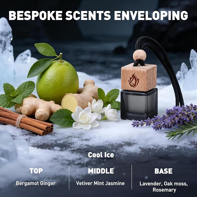 - LAYERED COOL ICE CAR SCENT: Top notes zesty bergamot and spicy ginger for crisp energizing vibes. Heart notes earthy vetiver cooling mint and delicate jasmine for fresh balanced aroma. Base notes calming lavender woody oakmoss and rosemary for soothing long lasting scent. Great for men who crave a non overpowering cool ice fragrance that stands out from ordinary car air fresheners.